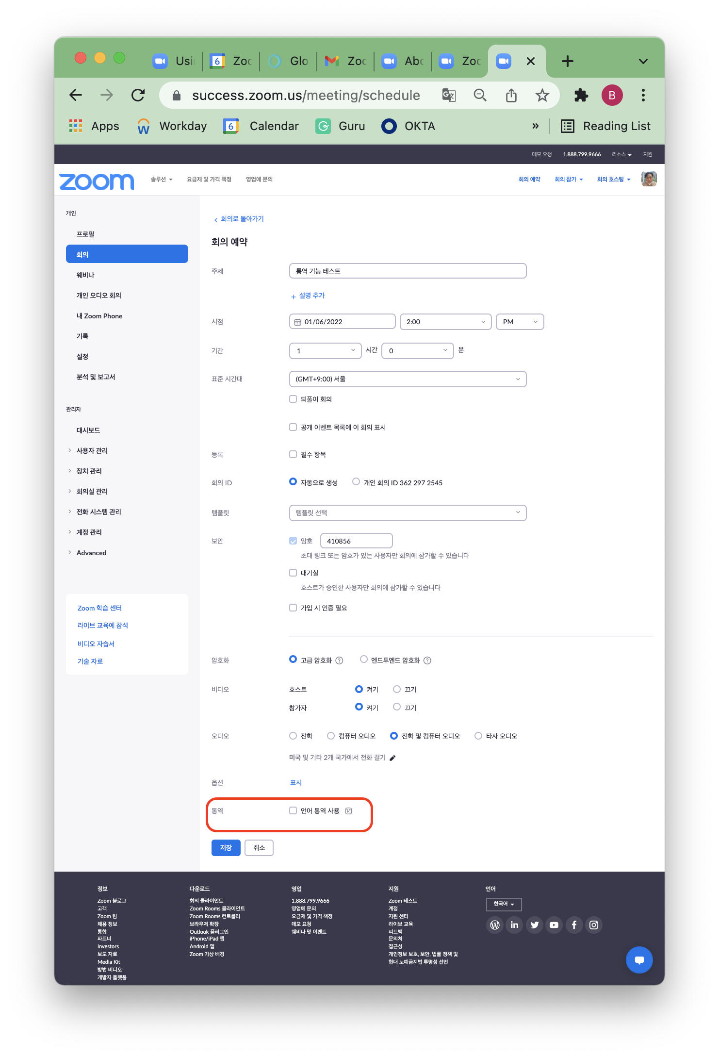 줌 미팅 예약 페이지에서 맨 아래에 있는 "언어 통역 사용"을 체크합니다.