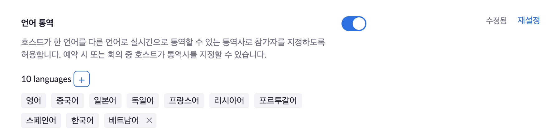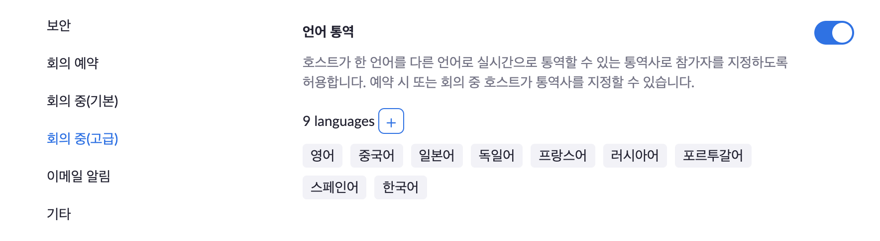 그리고, 언어 통역 (Langugafe Interpretation) 기능을 활성화합니다. 줌은 기본적으로 9개의 언어가 제공합니다.