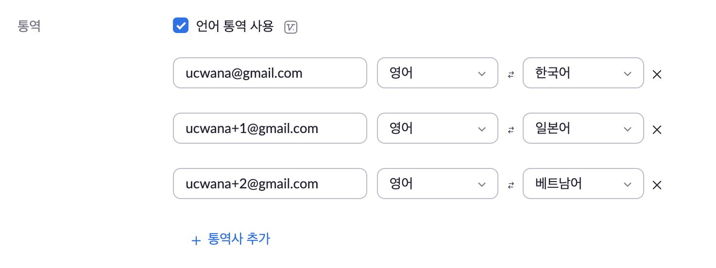 - 통역사는 반드시 통역사로 지정한 이메일로 로그인 (미팅에서 호스트가 수동 지정도 가능)