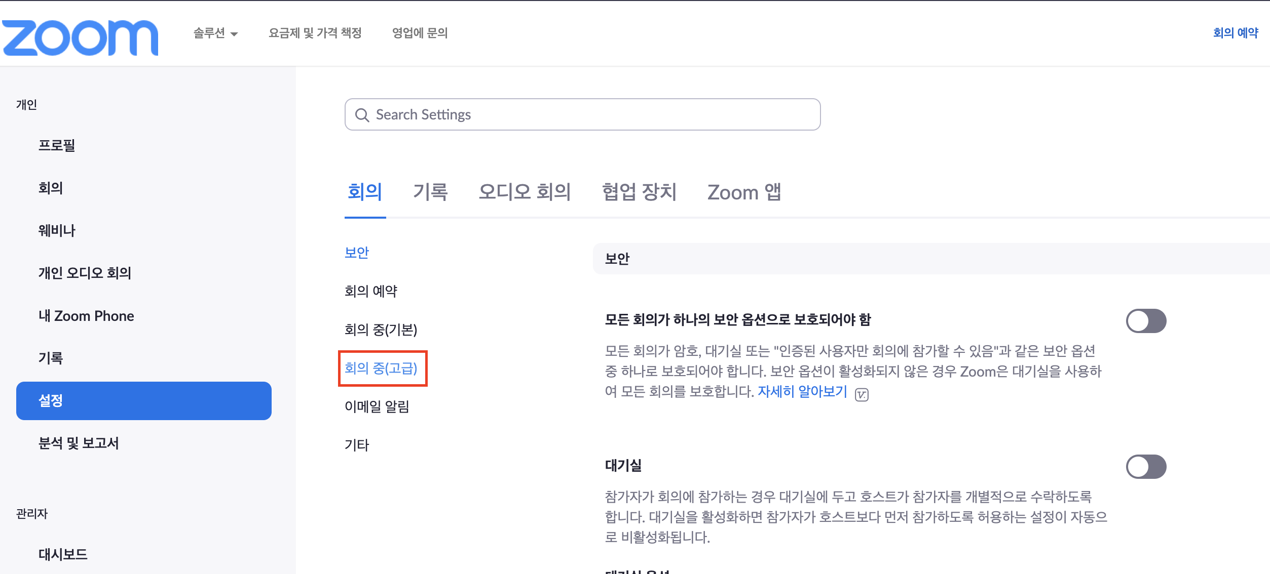 줌 미팅 관리자는 통역 관련 설정을 합니다. 관리자 페이지에서 "설정 (setting) >> 회의 >> 회의중 (고급)" 탭을 선택합니다.