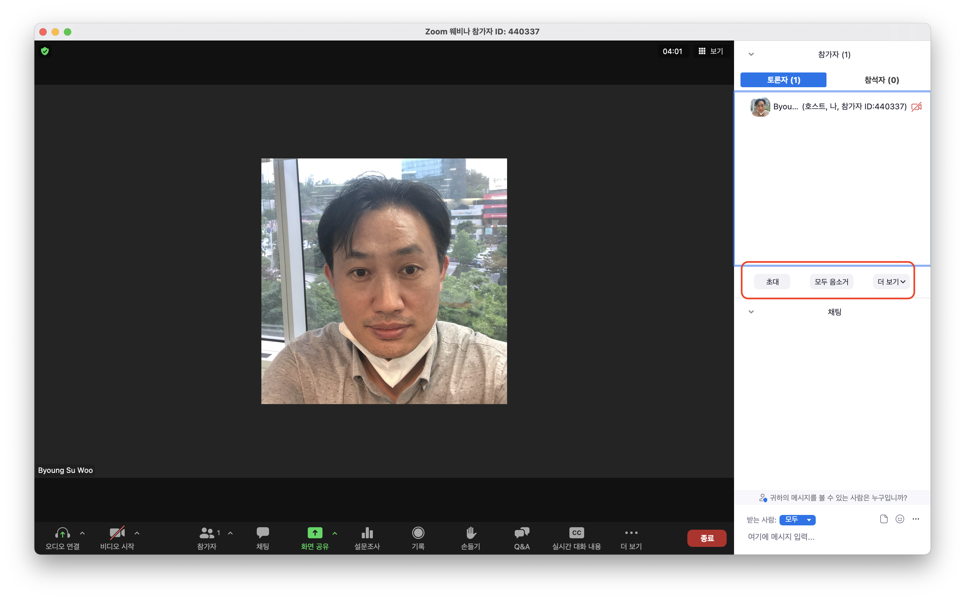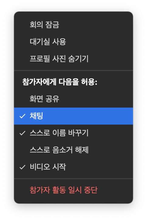 회의를 개최한 호스트 외에 다른 참가자들에게 화면 공유 권한을 주거나 주지 않습니다. - 채팅