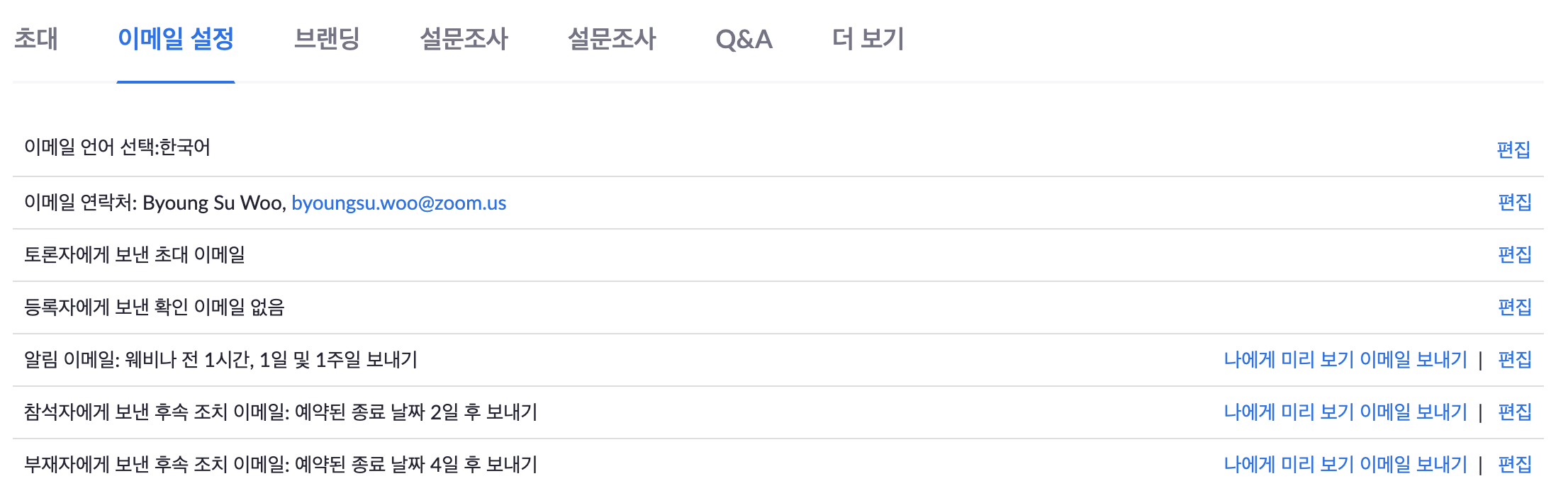 줌 웨비나를 예약하면 등록 및 초대 이메일, 브랜딩, 설문조사, Q&A 등 상세한 설정이 가능합니다.
