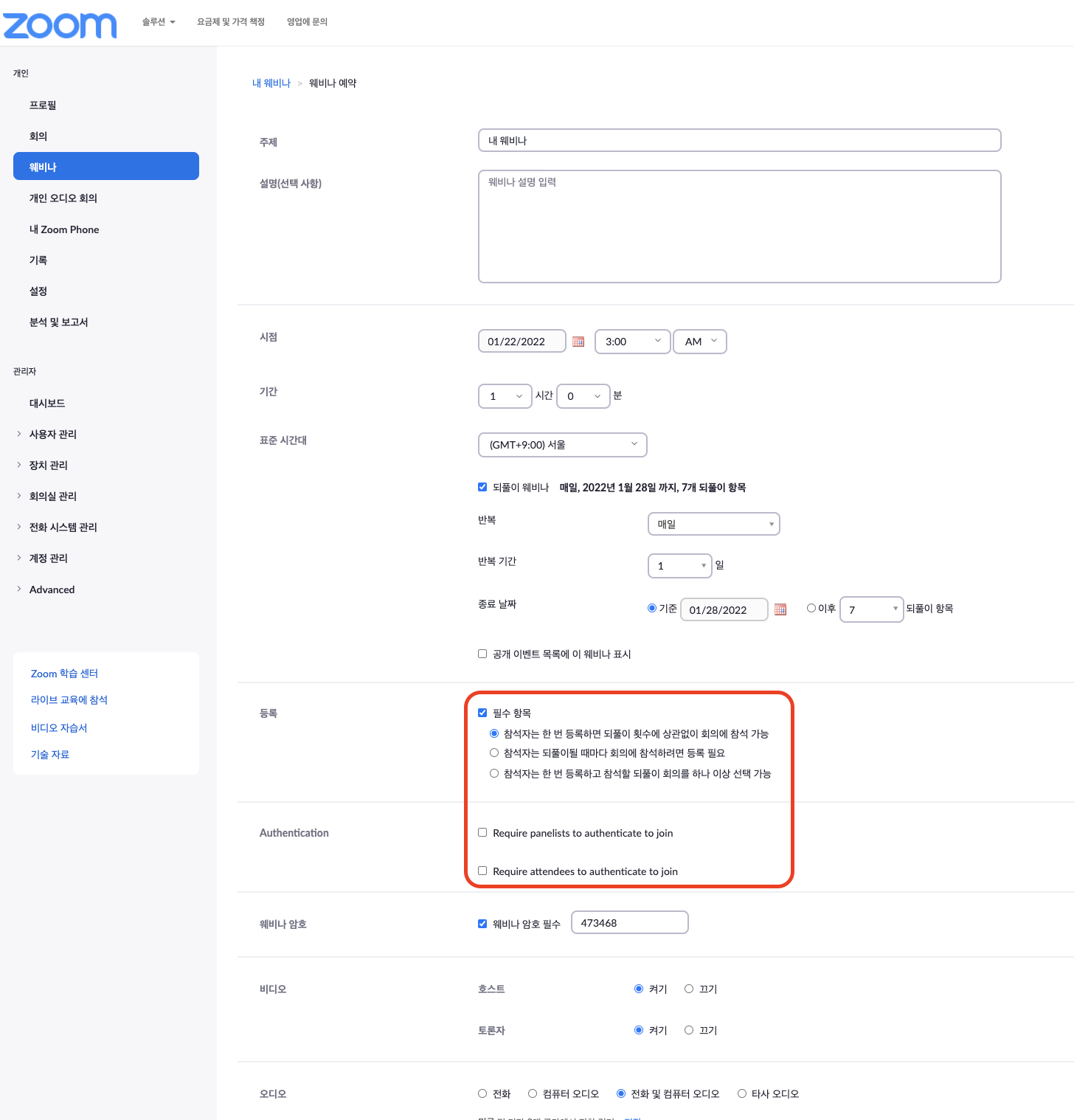 참석자들의 보안 의식 미숙으로 링크와 암호를 마음대로 공유하기도 합니다. 이럴 경우 대기실을 만들어 정확한 이름과 이메일 주소를 입력한 사람들만 관리자가 허가를 해주고 입장을 시킬 수 있습니다. 참석자가 확실한 경우에는 대기실을 사용하지 않지만, 이번과 같이 불특정 다수를 대상으로 할 때 반드시 대기실 기능을 커야 합니다. - 가입 시 인증 필요