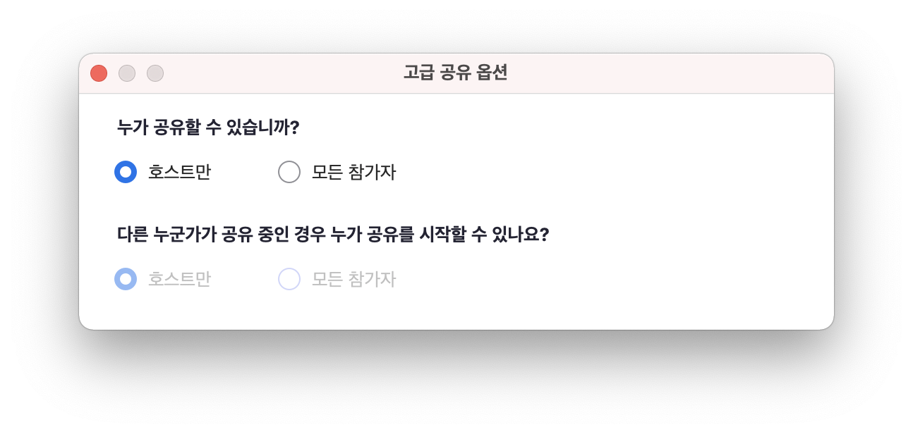 "보안" 버튼의 사용법을 모른다면, 화면 공유 버튼에서 아래와 같이 공유 권한을 세부적으로 정할 수 있습니다. 여기에서 "호스트만"을 설정했어도 공유를 막을 수 있었습니다.
