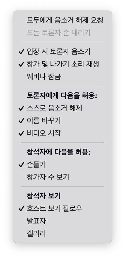회의를 개최한 호스트 외에 다른 참가자들에게 스스로 이름 바꾸기 권한을 주거나 주지 않습니다. - 스스로 음소거 해제