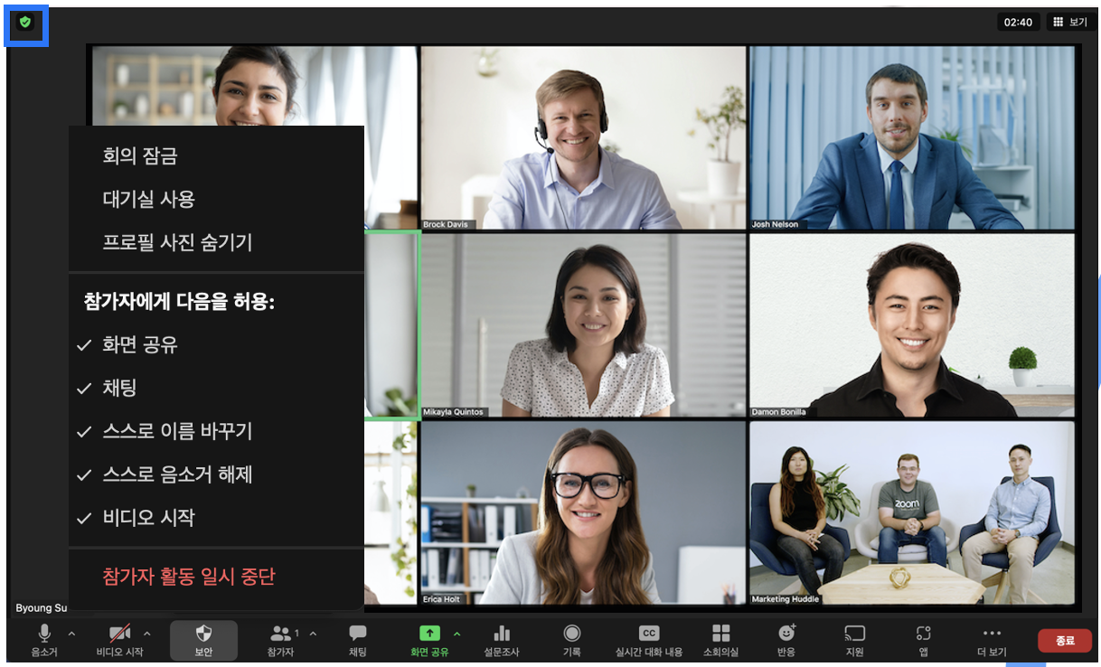 줌은 온라인 미팅 및 온라인 강의를 제공하는 솔루션입니다.줌 미팅은 온라인 회의 예약이 제대로 되지 않았더라도 줌 호스트가 실시간으로 회의를 통제할 수 있습니다. 아래 그림과 같이 보안 버튼을 클릭하여 보안 기능을 제어할 수 있습니다.