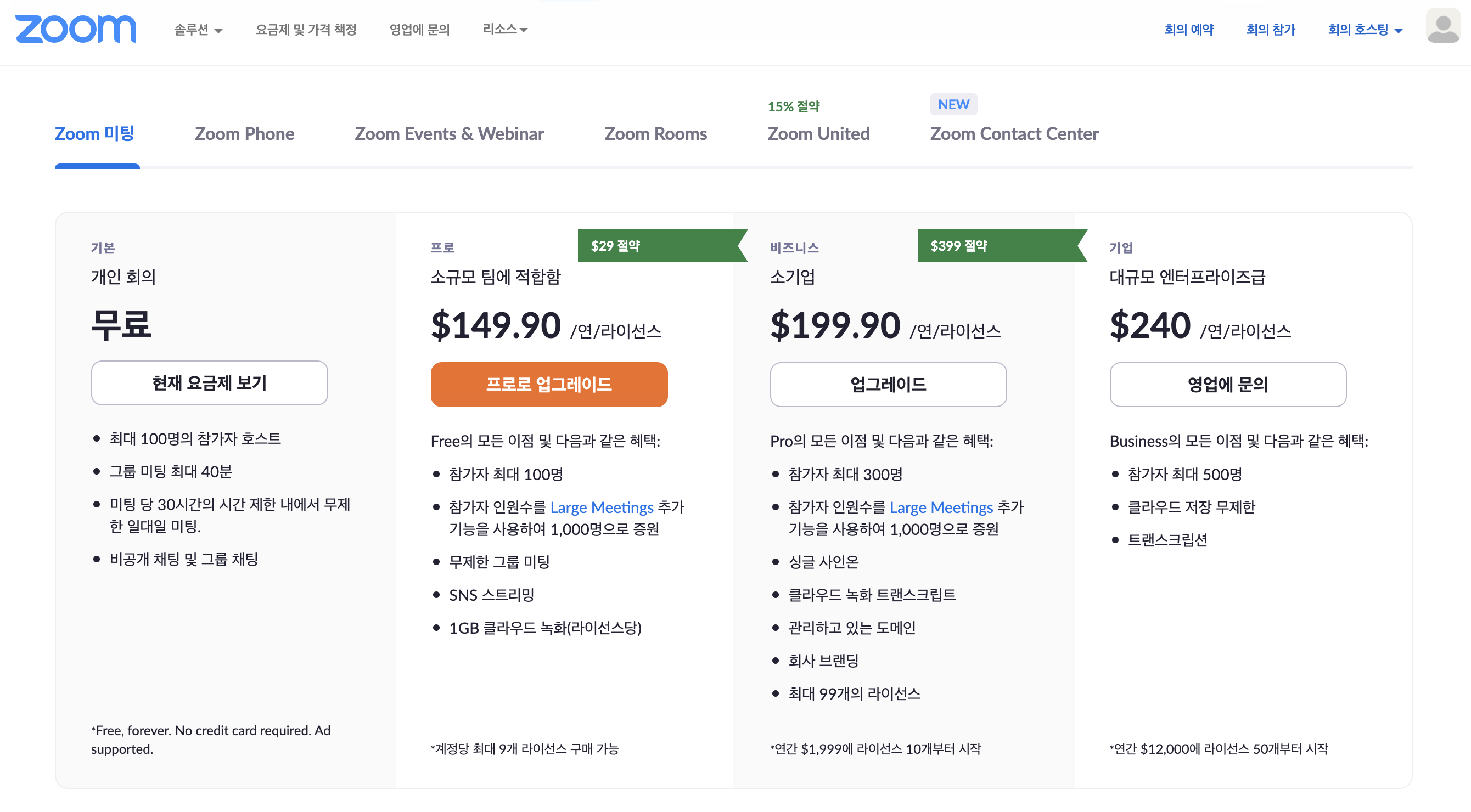 'COVID-19 판데믹 이후 '줌 미팅 유료화' 이슈를 알기 위해 줌 미팅 라이선스 정책을 간단히 설명합니다. 줌 미팅 라이선스는 줌 베이직(Zoom Basic), 줌 프로 (Zoom Pro), 줌 비즈니스 (Zoom Business), 줌 엔터프라이즈 (Zoom Enterprise)가 있습니다. 특히, 줌 베이직 (Zoom Basic) 라이선스는 한 미팅에 최대 100명까지 참가할 수 있고 한 번에 40분 동안 미팅을 할 수 있는 무료 미팅 서비스입니다. 그룹 미팅이 아닌 일대일 미팅은 한 번에 30시간까지 회의할 수 있습니다.
