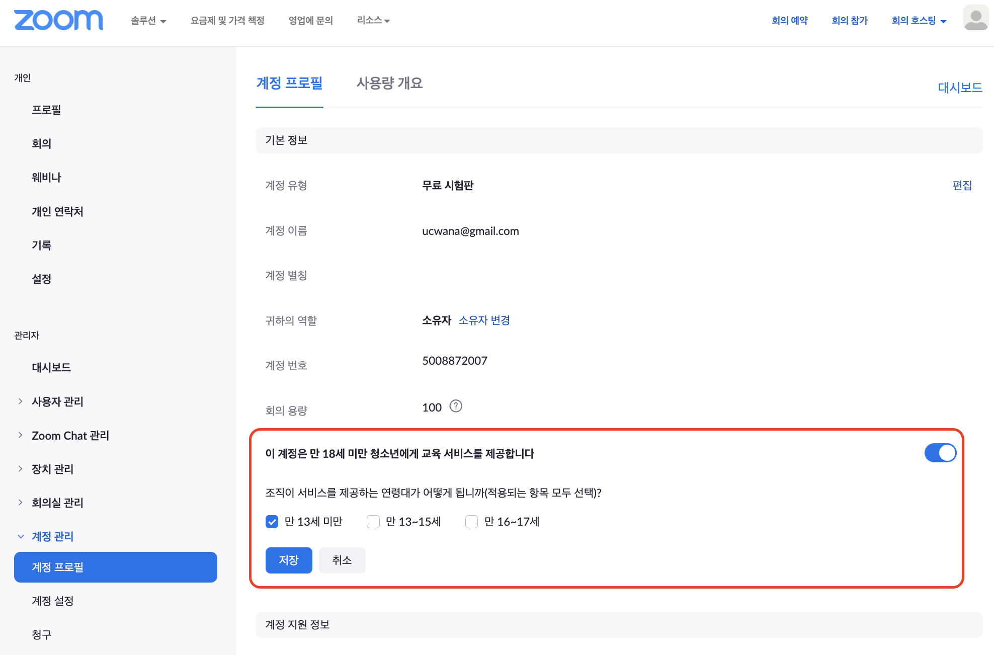 참고로, 줌 베이직 라이선스를 사용하는 교사가 '미팅 당 40분 제한'을 해제하기 위해 줌 웹페이지에서 "계정 관리 >> 계정 프로필" 메뉴에서 "이 계정은 만 18세 미만 청소년에게 교육 서비스를 제공합니다" 옵션을 활성화하고 학교 정보를 입력합니다.