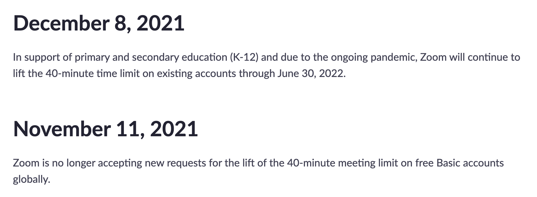 줌 미팅 베이직 라이선스에 '미팅 당 40분 제한 해제'에 대한 신규 요청을 더 이상 받지 않음 - 2021년 12월 8일