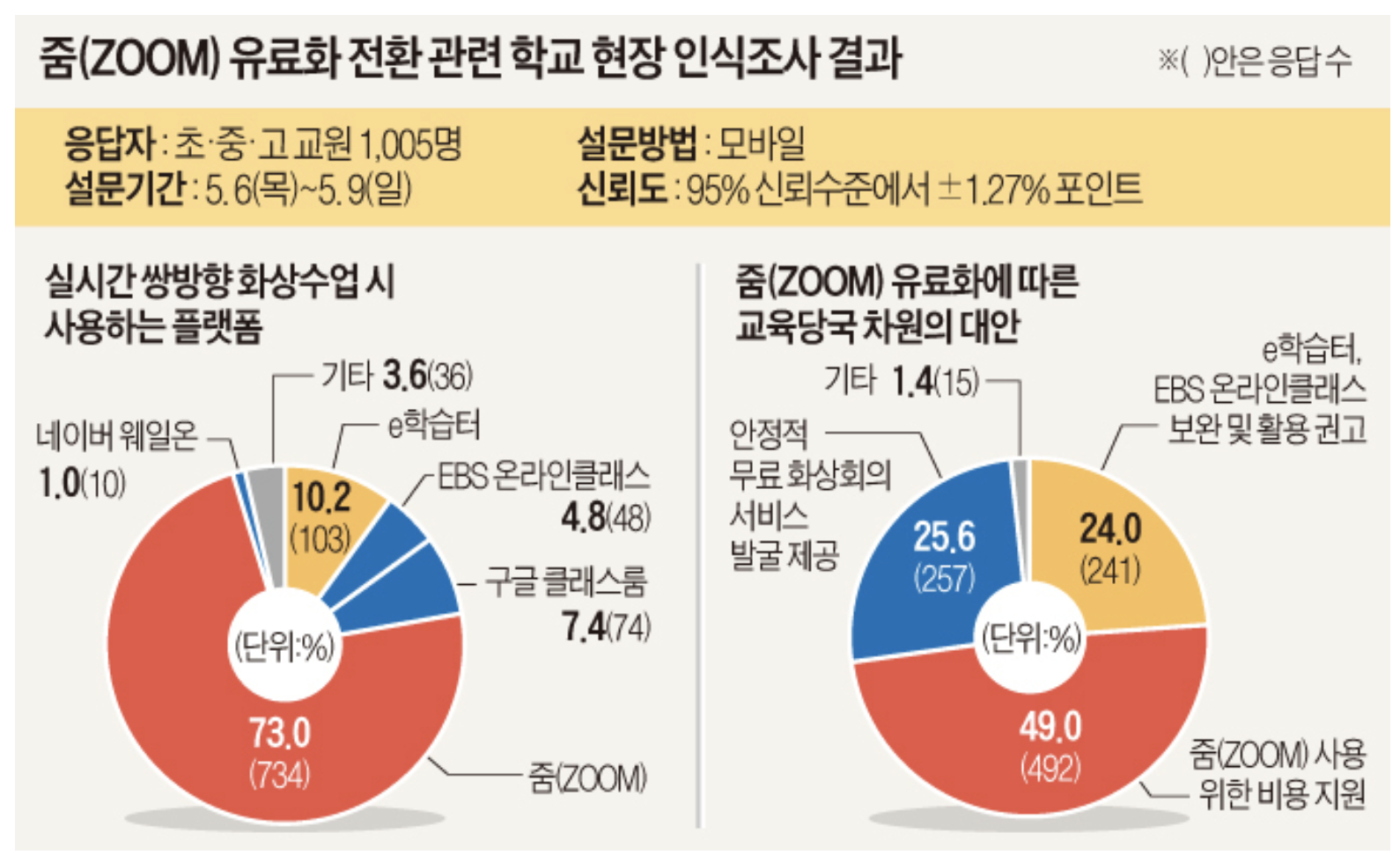 - 온라인 수업 플래폼 : 교원의 73%가 줌 미팅을 사용/ e학습터 10.2% / 구글 클래스룸 7.4% / EBS 온라인 클래스 4.8%